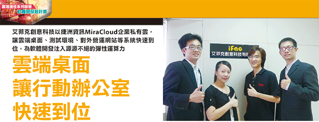 MiraCloud企業私有雲不但有超乎想像的效能與彈性,加上捷洲資訊服務團隊的技術能力與服務品質,也是艾菲克非常倚重的一環。宋柏修總監坦言,由於公司內主要以軟體開發為主,因此在硬體與系統維護上,需要仰賴更多合作夥伴的專業協助,幫助艾菲克快速調整硬體架構,建構穩定、安全、快速,且高彈性的底層架構,好讓上層的軟體開發沒有後顧之憂。