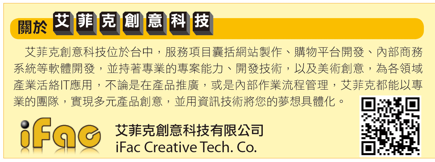 由志同道合的夥伴一起創立的艾菲克創意科技,是一間位在台中的軟體開發公司,主要的業務內容,是協助企業開發各式內部系統、網站,並提供美術設計等多項資訊軟體服務,可根據各種企業不同的需求,量身打造符合應用之客製化系統,幫助各規模企業活絡資訊應用,提升產業競爭視野。
